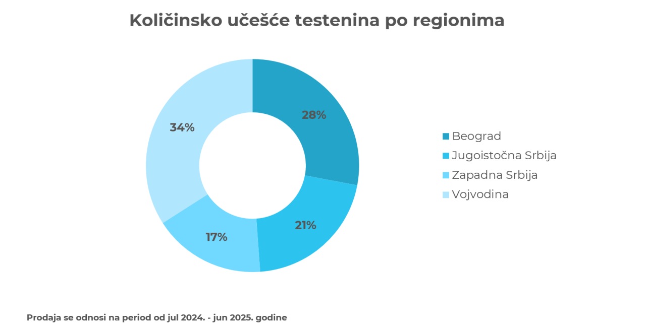 Ukoliko pogledamo trend količinske prodaje testenine, prema tom kriterijumu prednjači Vojvodina sa 34,1%, potom ide Beograd sa 28%, sledi regija jugoistočne Srbije sa 20,9%, dok je na poslednjem mestu centralno-zapadna Srbija sa 17,1%.