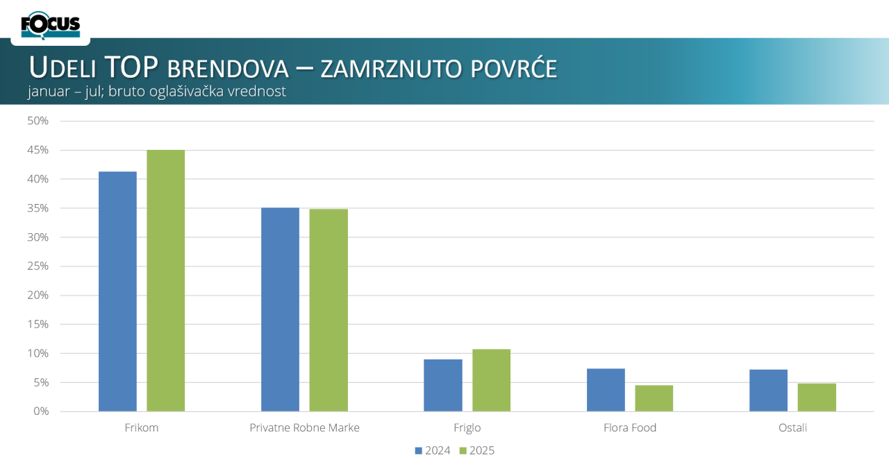 Drugi dijagram: Kategorija zamrznutog povrća solo sve više se konsoliduje oko vodeća tri brenda. Frikom ostaje dominantan i u prvih sedam meseci beleži rast sa 41,3% u 2024. na 45,1% u 2025. godini, dodatno učvršćujući lidersku poziciju. Privatne robne marke ukupno zadržavaju snažan udeo po bruto oglašivačkoj vrednosti, zadržavši se na drugom mestu uz blagi pad sa 35,1% na 34,8%. Rast ostvaruje i Friglo, koji povećava udeo sa 9% na 10,8% i time jača svoju poziciju na tržištu. Flora Food beleži pad sa 7,4% na 4,5%, dok ostali brendovi takođe gube, spuštajući se sa 7,2% na 4,8%. Ukupni trend jasno pokazuje jačanje ključnih igrača, naročito Frikoma i Frigla.