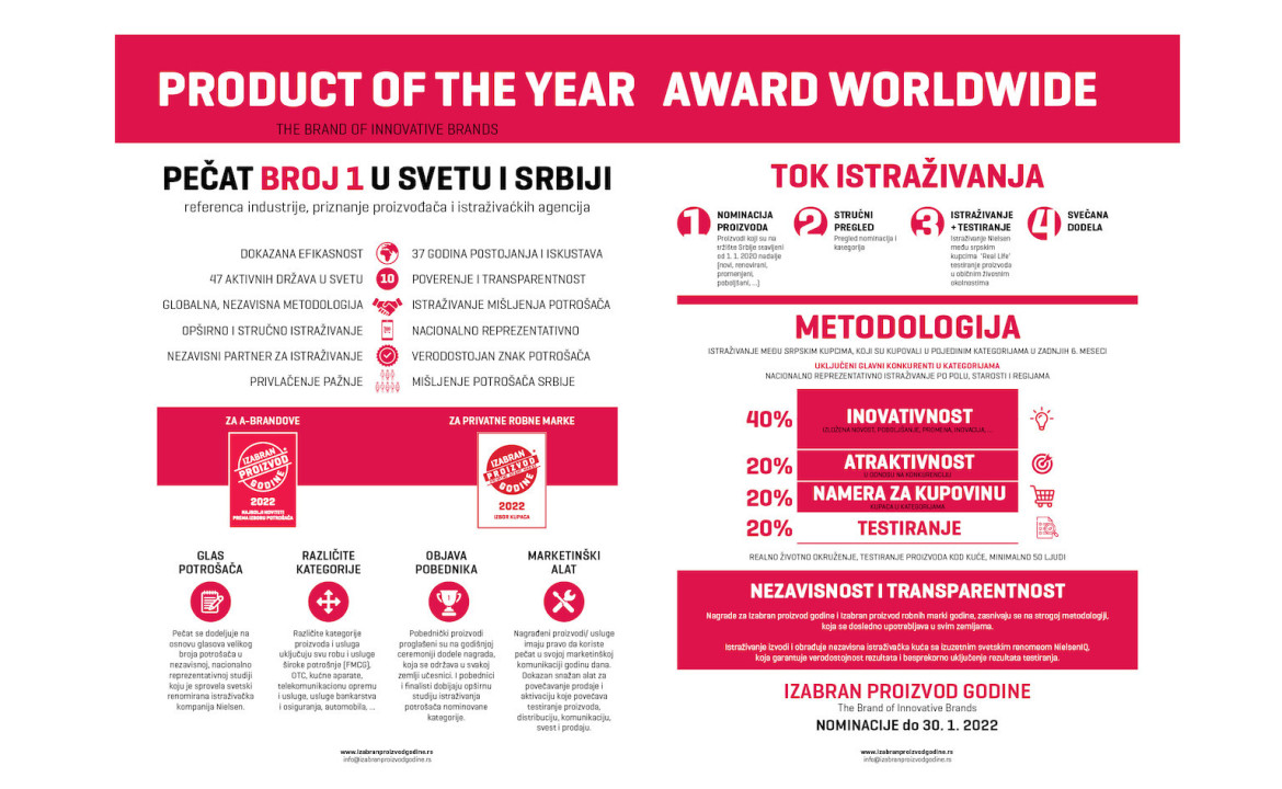Iz organizacije Izabran proizvod godine pozivaju sve zainteresovane kompanije da se prijave, a više informacija o načinu prijave možete da pogledate na zvaničnom sajtu.