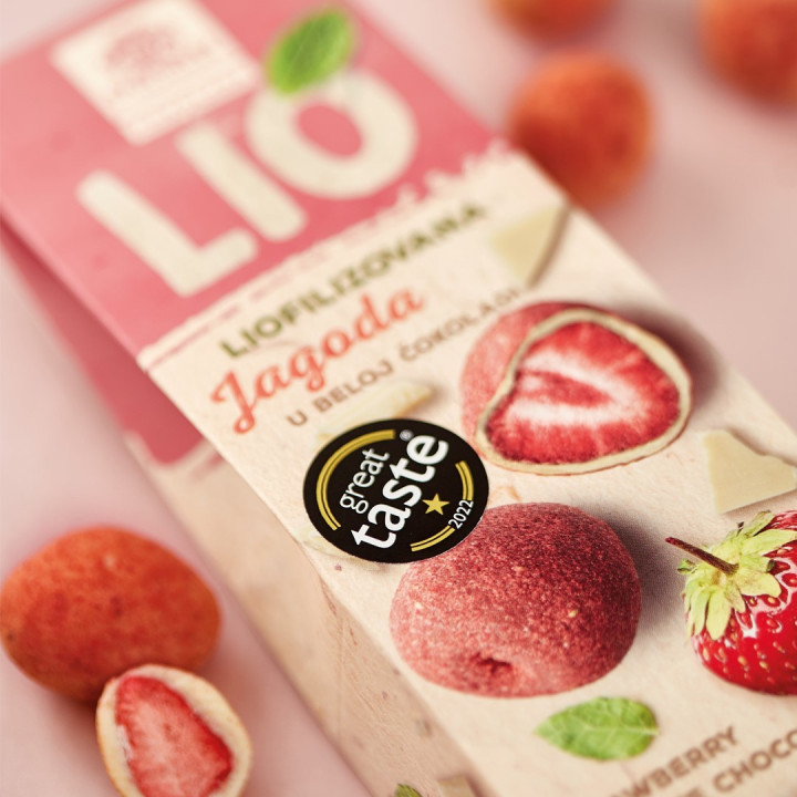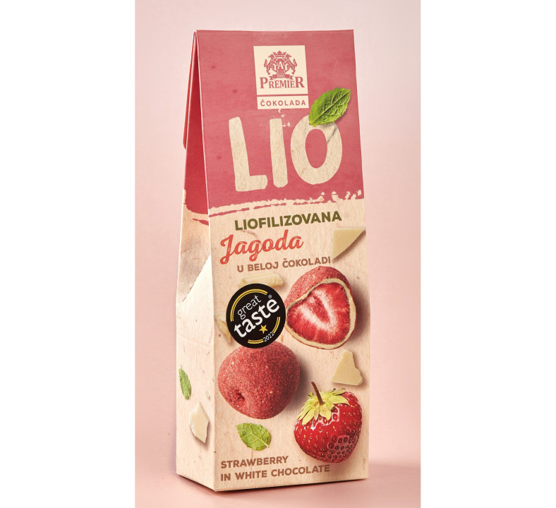 Premier LIO draže bombone sa liofilizovanom jagodom u beloj čokoladi, predstavljaju deliciju nastalu zahvaljujući savremenom procesu očuvanja svih najvrednijih svojstava voća, kombinovanog sa najkvalitetnijom belom čokoladom. Ovaj proizvod samo je jedan deo bogate palete LIO liofilizovanog voća u čokoladi, borovnica, malina, kupina, jagoda i čuvene srpske Oblačinske višnje. Voće koje je sačuvalo ne samo oblik, već i miris, ukus i vredne nutrijente, dobijeno je savremenim i pouzdanim procesom liofilizacije, osmišljenom da očuva sva važna prirodna svojstva, navodi se u saopštenju.