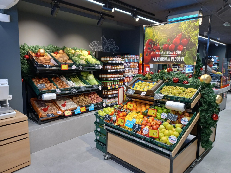 U renoviranom supermarketu potrošače očekuje širok asortiman proizvoda: mesara, mesne prerađevine, mlečni proizvodi i sirevi, odeljenje pijace sa velikim izborom voća i povrća, slani i slatki konditori, napici.