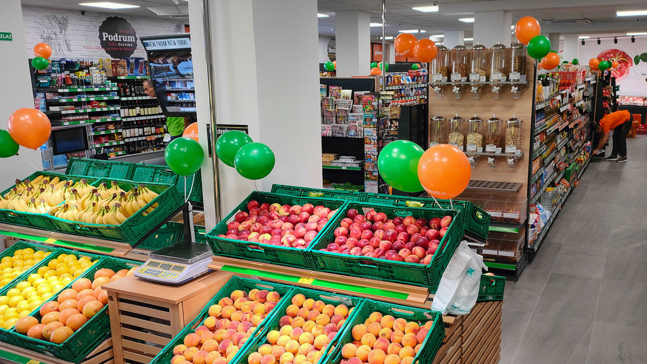 Ponuđeni asortiman uključuje mnogobrojne proizvode, od svežeg mesa i svežeg voća i povrća do kućne hemije. Radno vreme prodavnice je, radnim danima i subotom, od 7 do 21h, nedeljom - od 7 do 13h. Prodavnica broji šest novozaposlenih radnika.