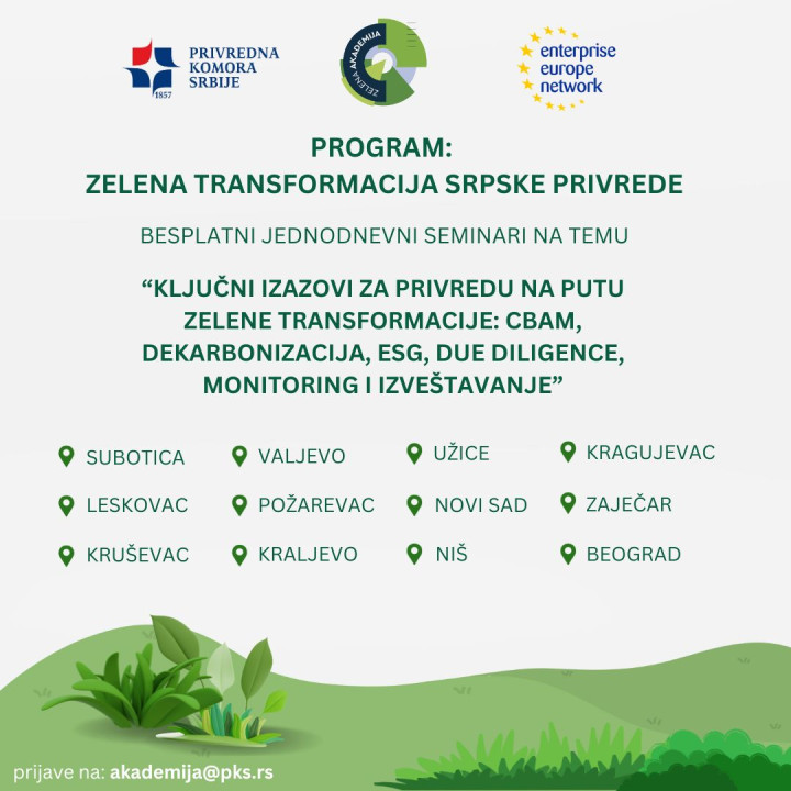 Prvi u nizu seminara počinje sutra, u četvrtak 13. novembra u RPK Subotica, a svi zainteresovani privrednici za temu zelene transformacije mogu se prijaviti na i-mejl adresu akademija@pks.rs.