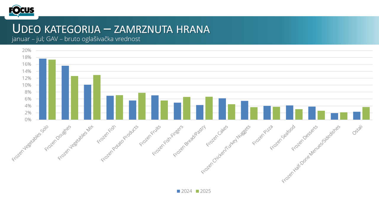 Prvi dijagram: Prikazani su udeli objava po bruto oglašivačkoj vrednosti za kategorije, tokom prvih sedam meseci, u periodu kada je u FMCG lifletima 2025. godine zabeleženo više od 5.600 objava – hiljadu više u odnosu na isti period prethodne godine, što potvrđuje visoku aktivnost i značaj tržišta u ovom segmentu. U kategorijama su primećene promene u periodu januar–jul 2024. i istog perioda 2025. godine. Najjače oglašavana kategorija, zamrznuto povrće solo, beleži blagi pad sa 17,7% na 17,3%. Zamrznuta testa opadaju sa 15,6% na 12,6%. Nasuprot tome, mešano povrće raste sa 10,1% na 12,9%. Zamrznuta riba ostvaruje umereni rast sa 6,9% na 7,1%. Najizraženiji porast beleži zamrznuti krompir, koji skače sa 5,6% na 7,8%.