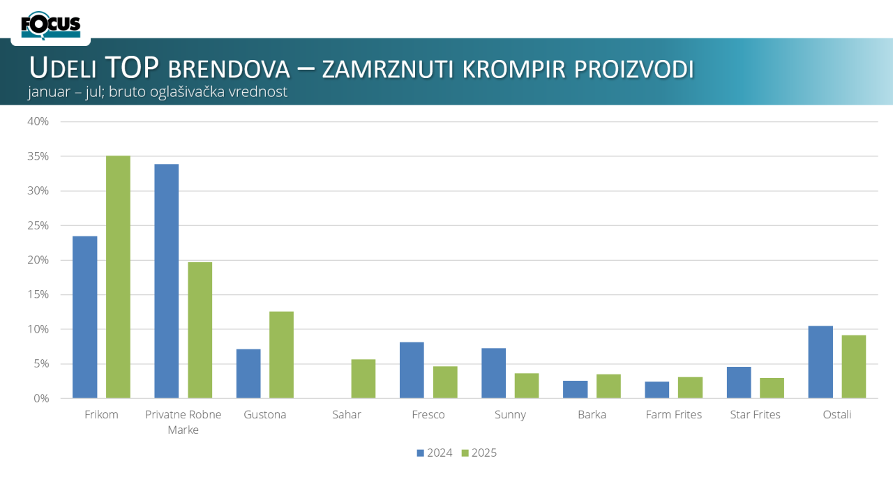 Drugi dijagram: Kategorija zamrznutog povrća solo sve više se konsoliduje oko vodeća tri brenda. Frikom ostaje dominantan i u prvih sedam meseci beleži rast sa 41,3% u 2024. na 45,1% u 2025. godini, dodatno učvršćujući lidersku poziciju. Privatne robne marke ukupno zadržavaju snažan udeo po bruto oglašivačkoj vrednosti, zadržavši se na drugom mestu uz blagi pad sa 35,1% na 34,8%. Rast ostvaruje i Friglo, koji povećava udeo sa 9% na 10,8% i time jača svoju poziciju na tržištu. Flora Food beleži pad sa 7,4% na 4,5%, dok ostali brendovi takođe gube, spuštajući se sa 7,2% na 4,8%. Ukupni trend jasno pokazuje jačanje ključnih igrača, naročito Frikoma i Frigla.